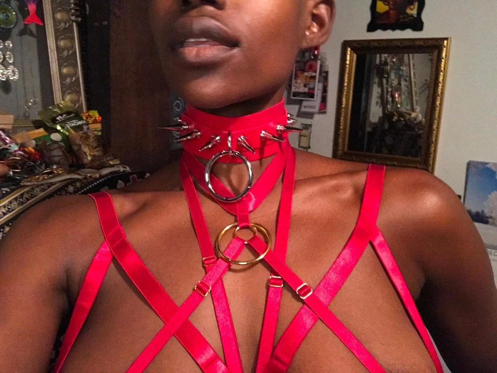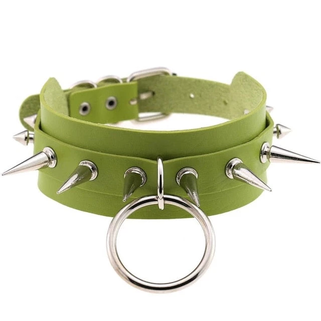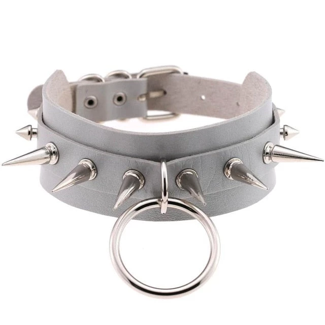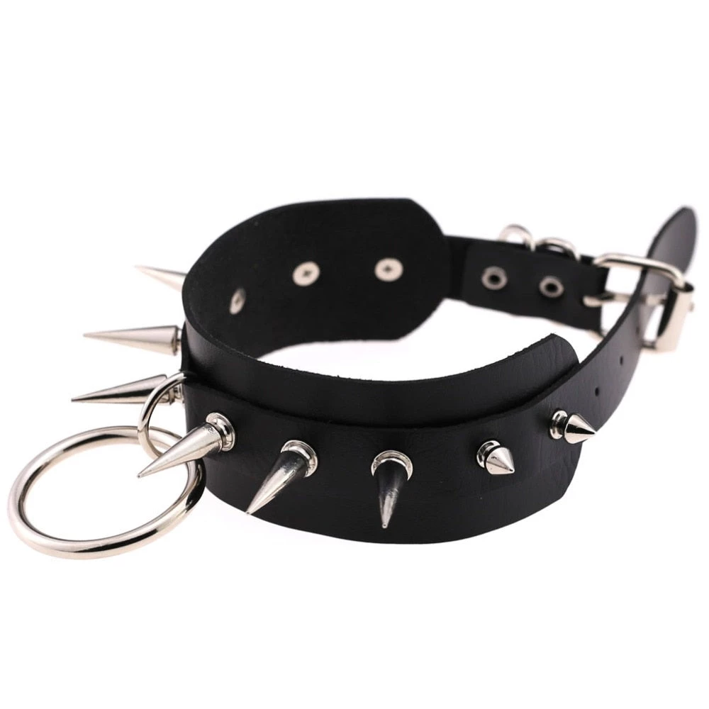 Not for the faint of heart! This choker comes equips with metal spikes and a large silver O-Ring.