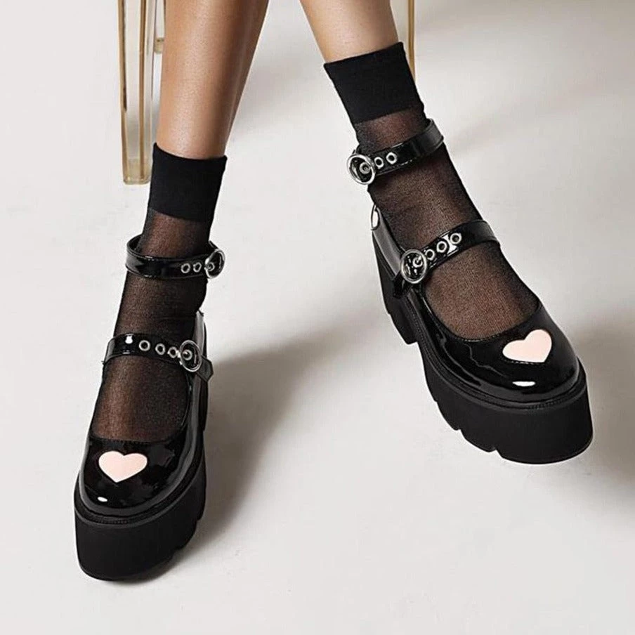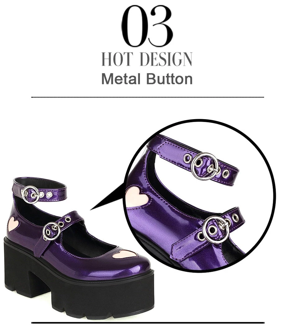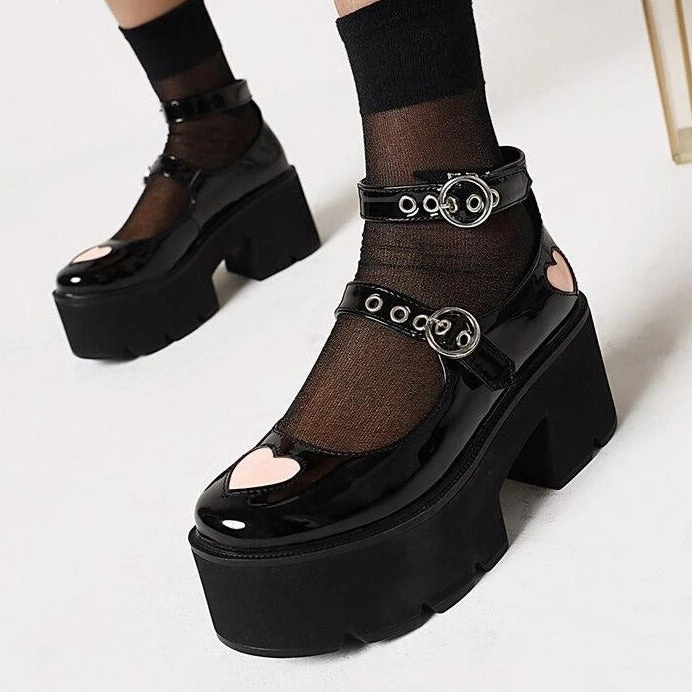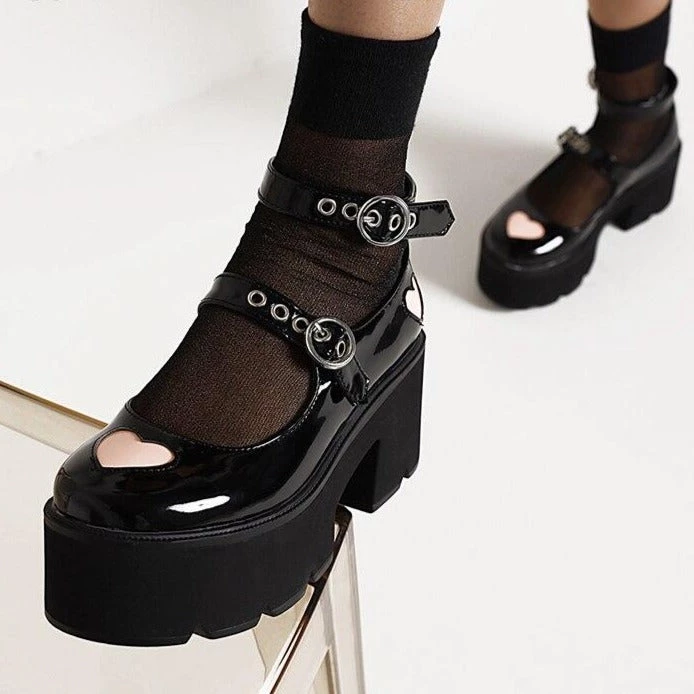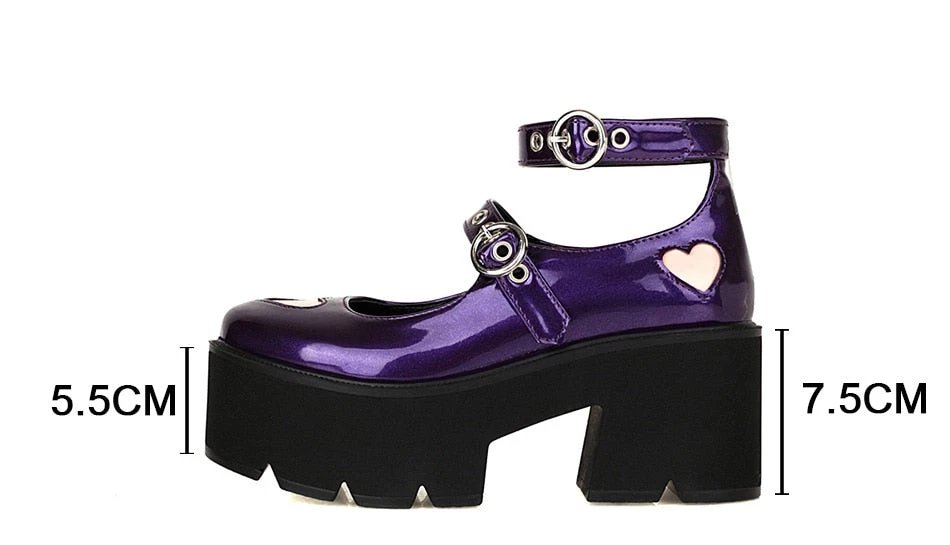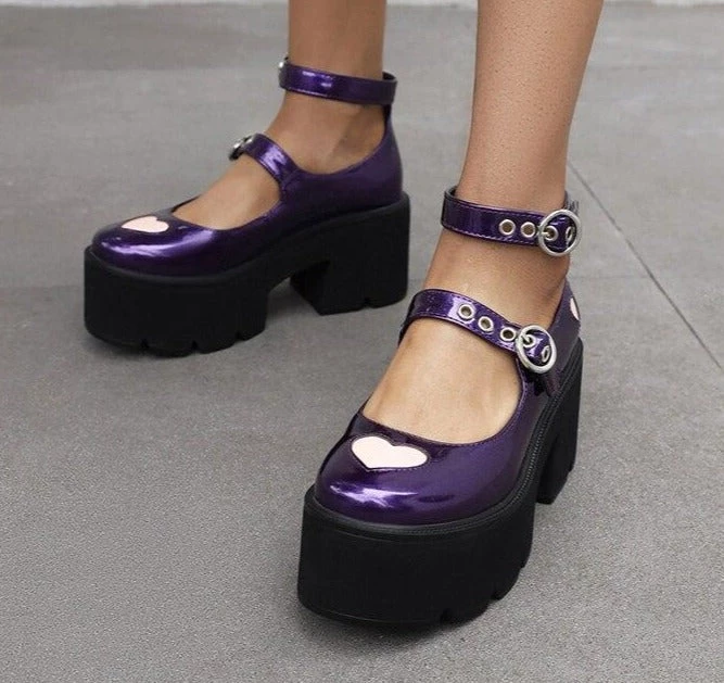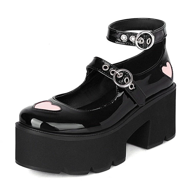 Chonky patent pleather mary jane platforms with a cute pink heart detail on the toe and heel.
