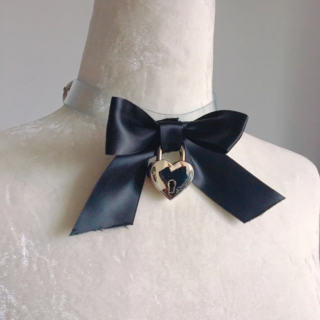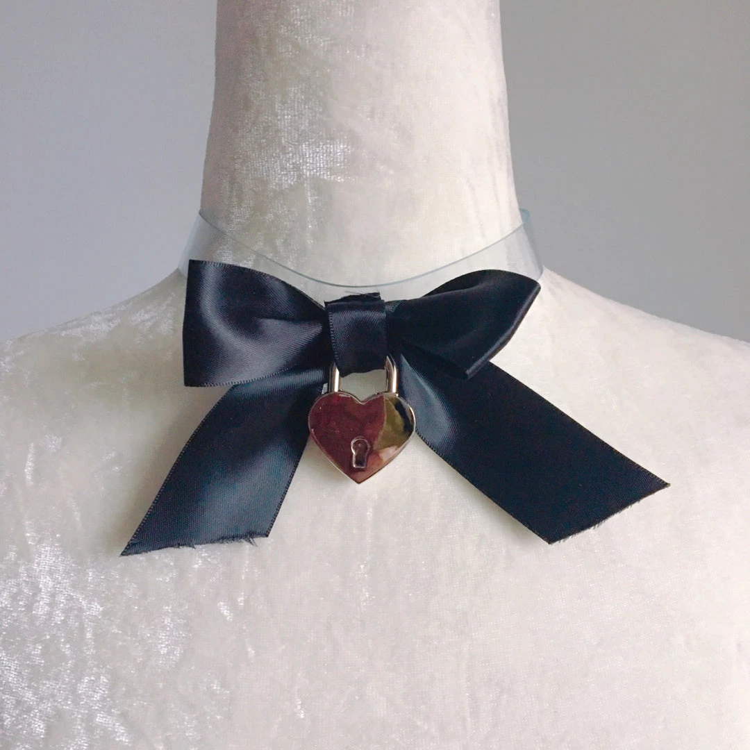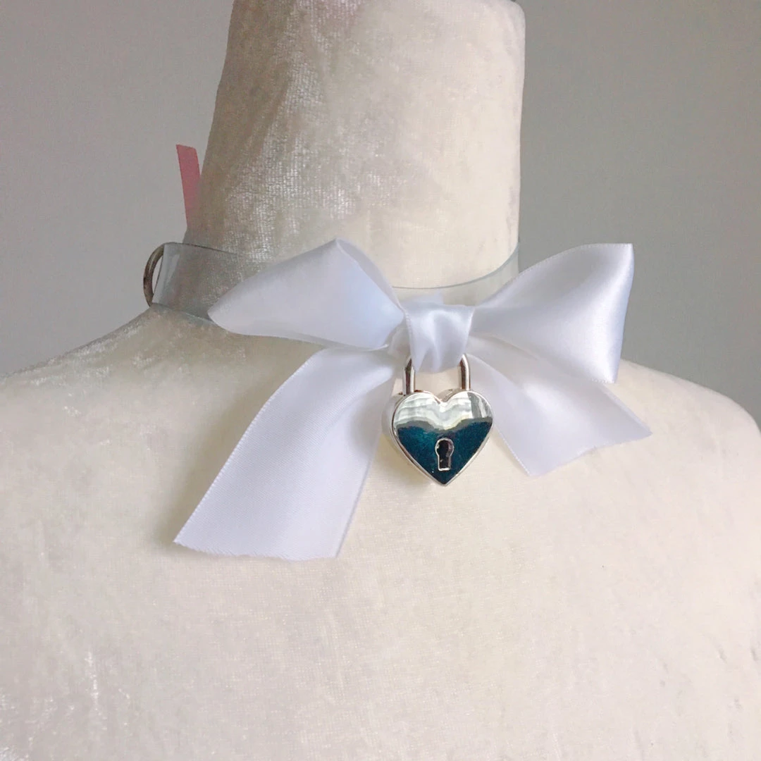 A cute, clear choker with a large satin ribbon and shiny silver heart lock. Real, functioning lock that comes with an accompanying key.