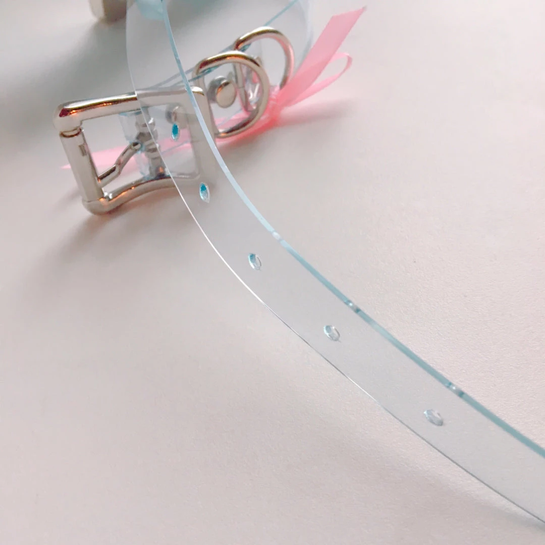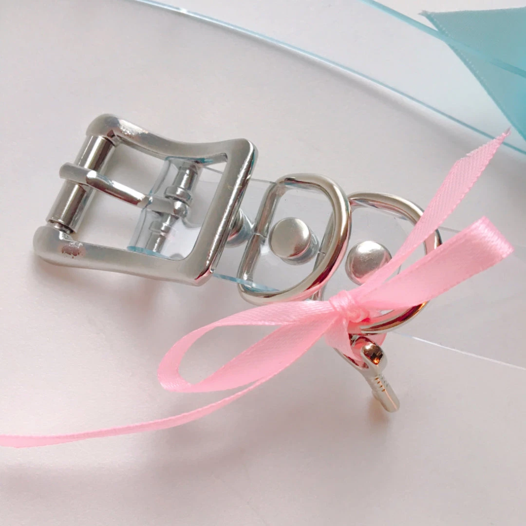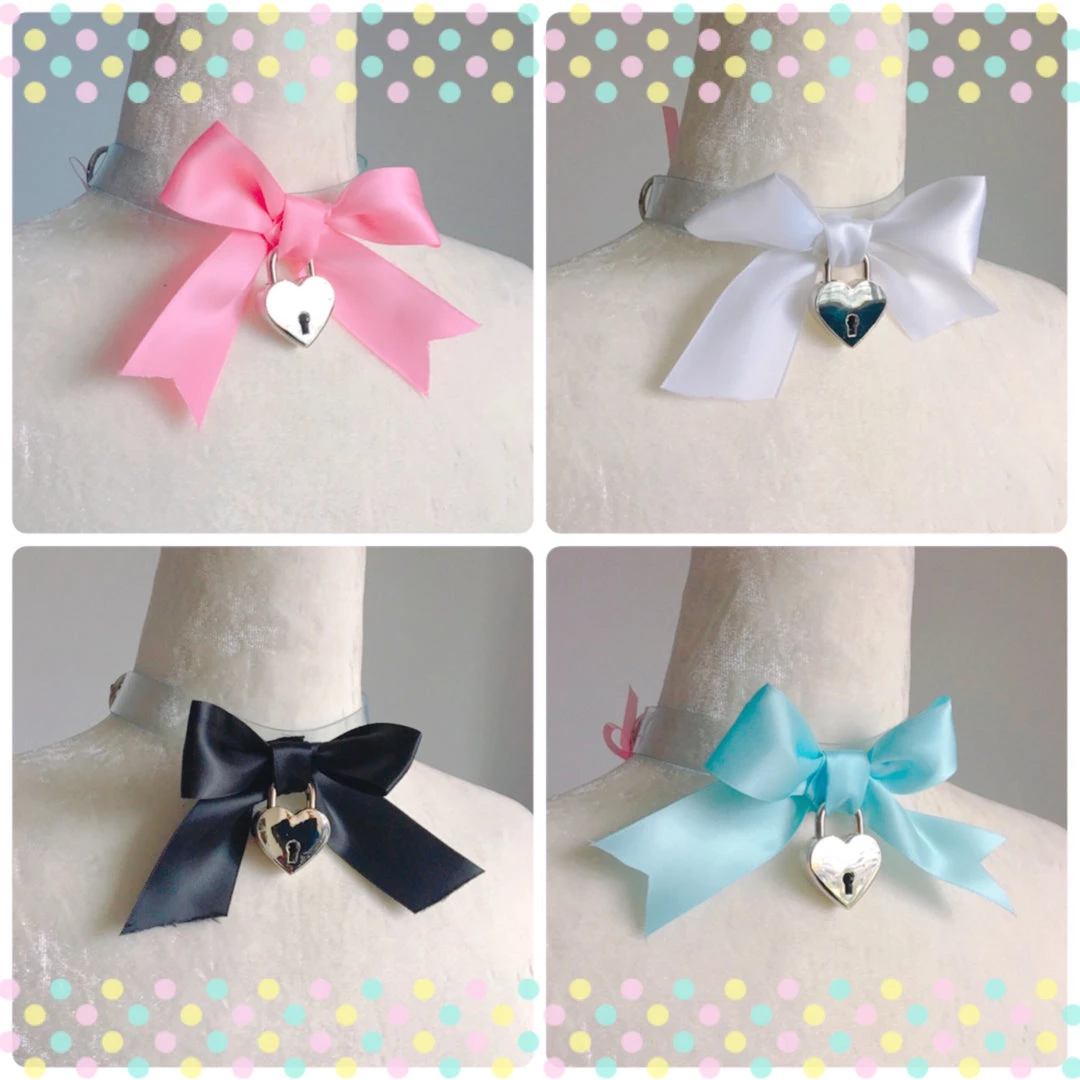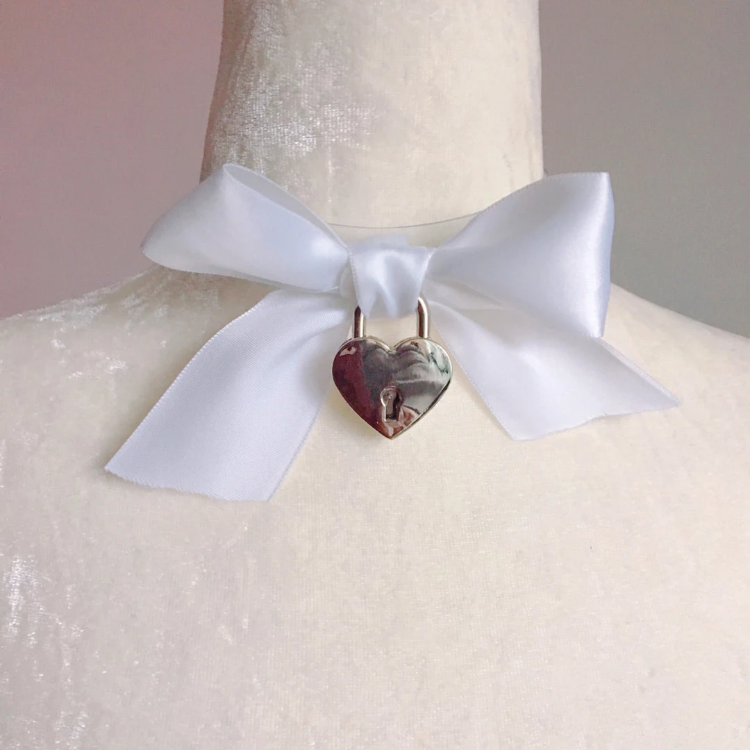 A cute, clear choker with a large satin ribbon and shiny silver heart lock. Real, functioning lock that comes with an accompanying key.