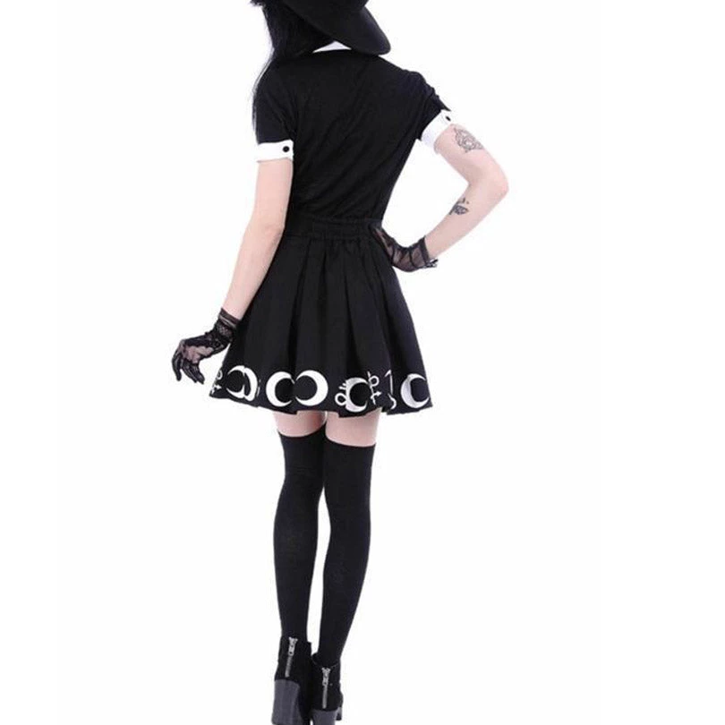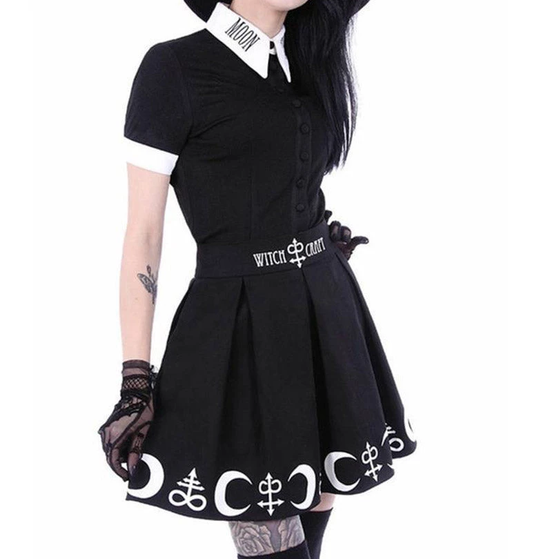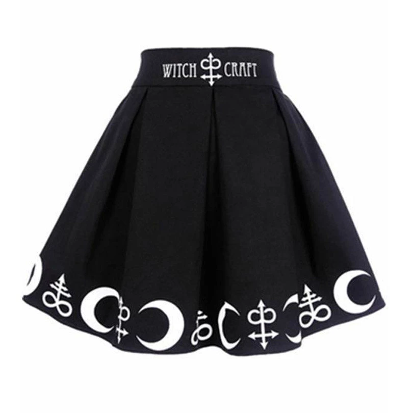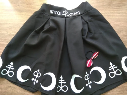 An edgy, high waisted, pleated skirt with witchy screen printed symbols on the hem and waistline. Stretchy waist band for added comfort.