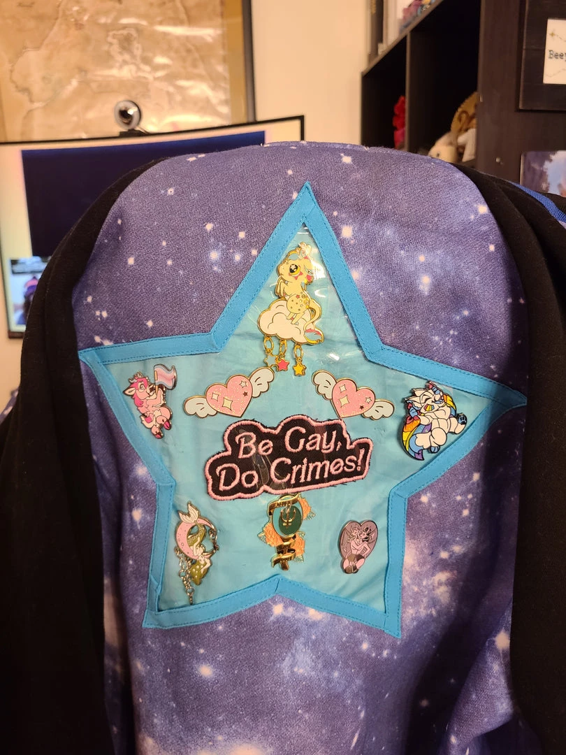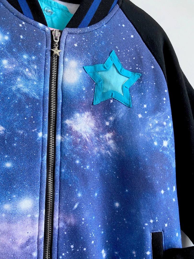 Made with soft, thick, hoodie material and featuring two ita pockets. One large star on the back and one smaller pocket on the front, both pockets trimmed with matching bias tape.