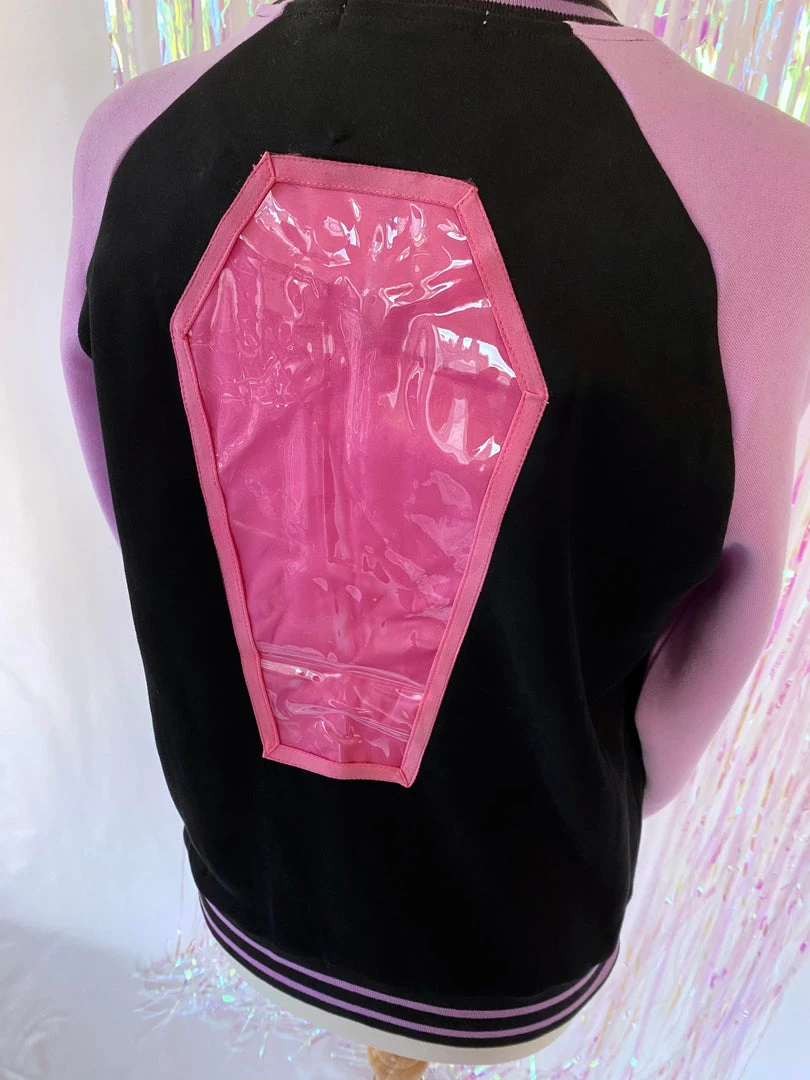 The Necromoon Ita Jacket is black with lavender sleeves, and pink accents.