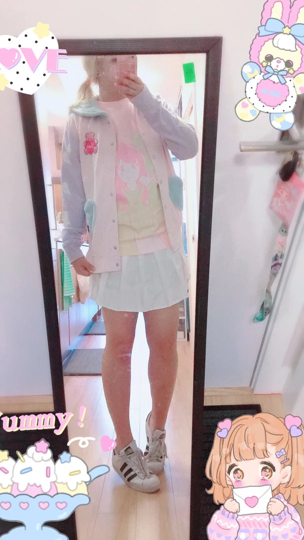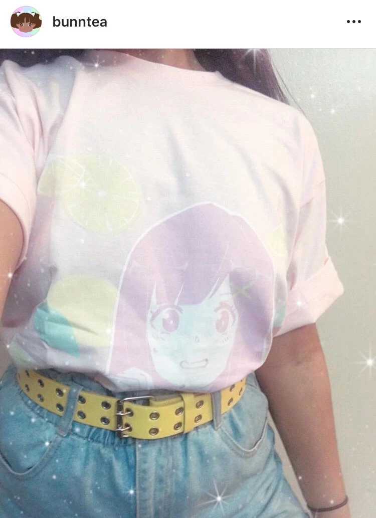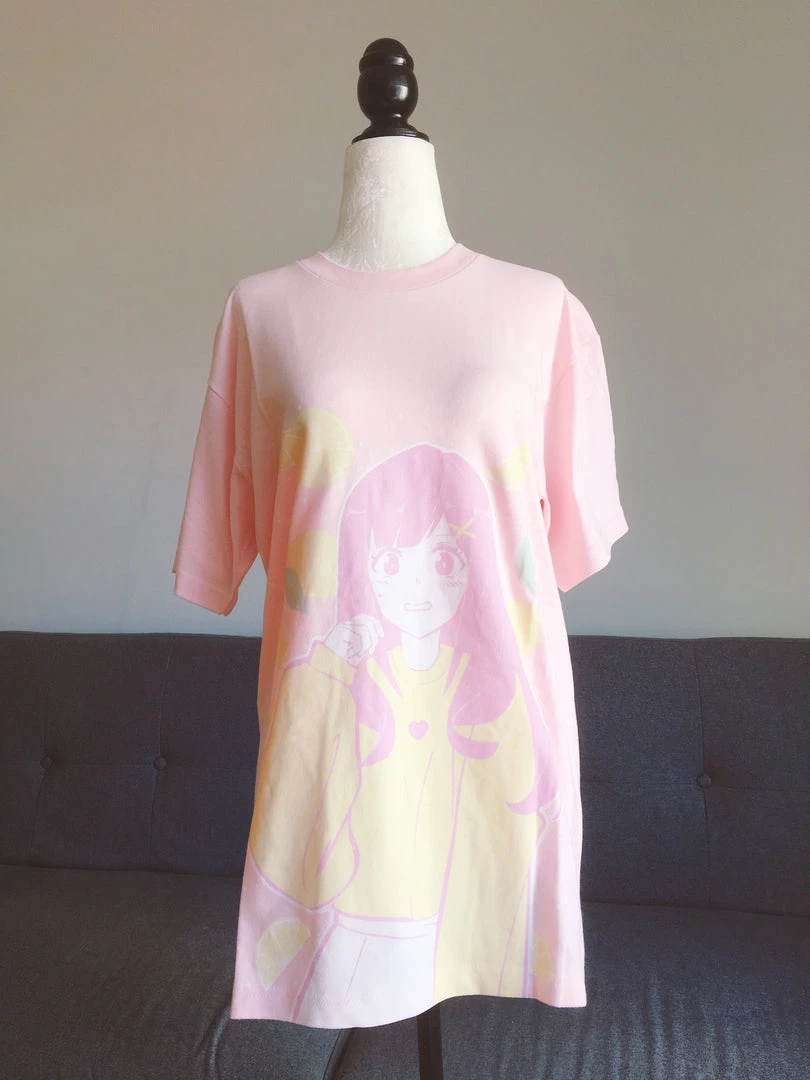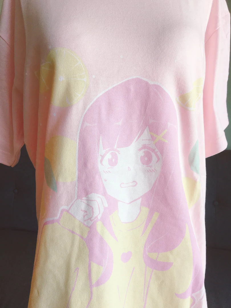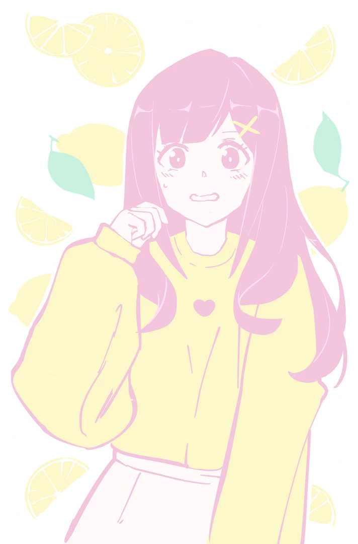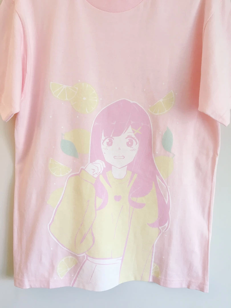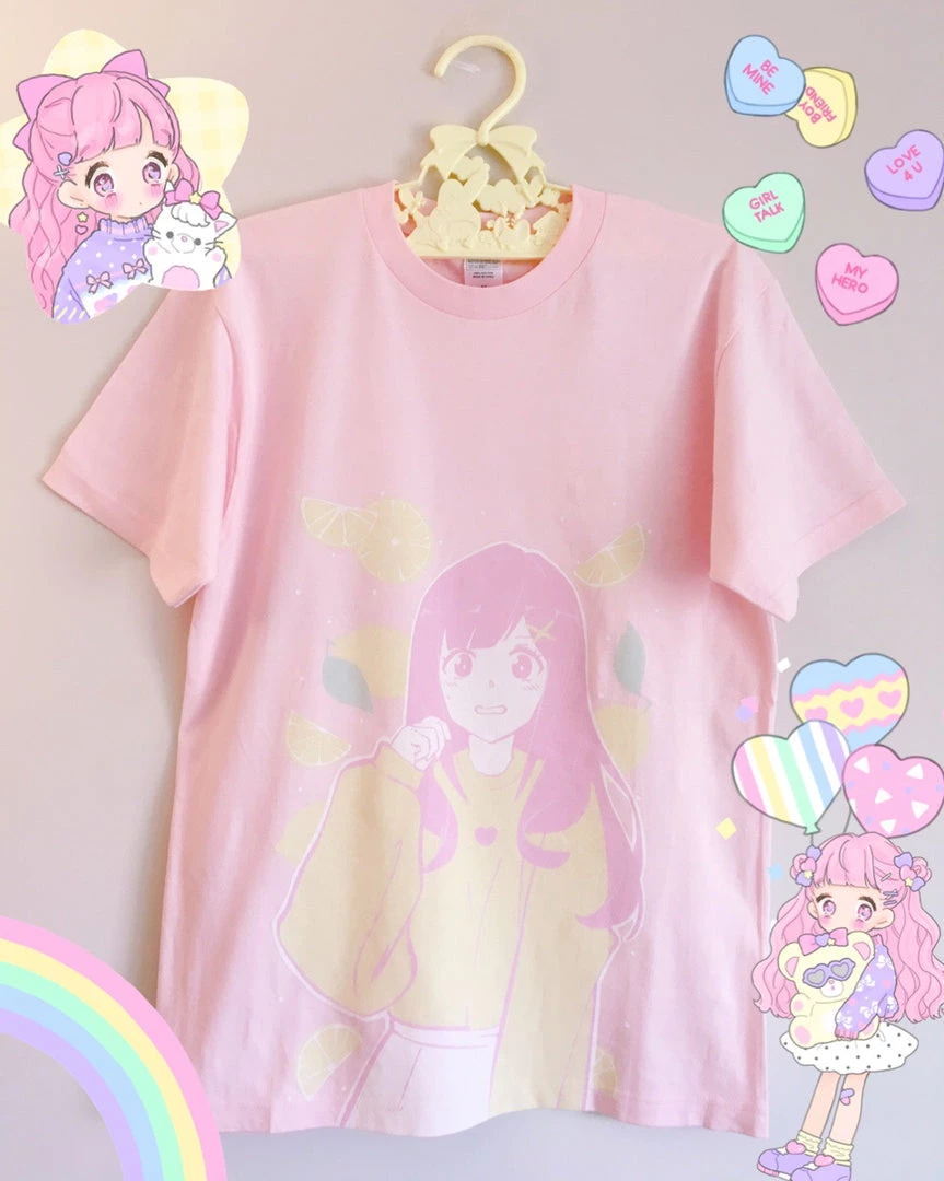New, limited edition design by fawnbomb featuring a shy girl with pink hair and a yellow sweater, seemingly caught in the middle of an innocent confession.