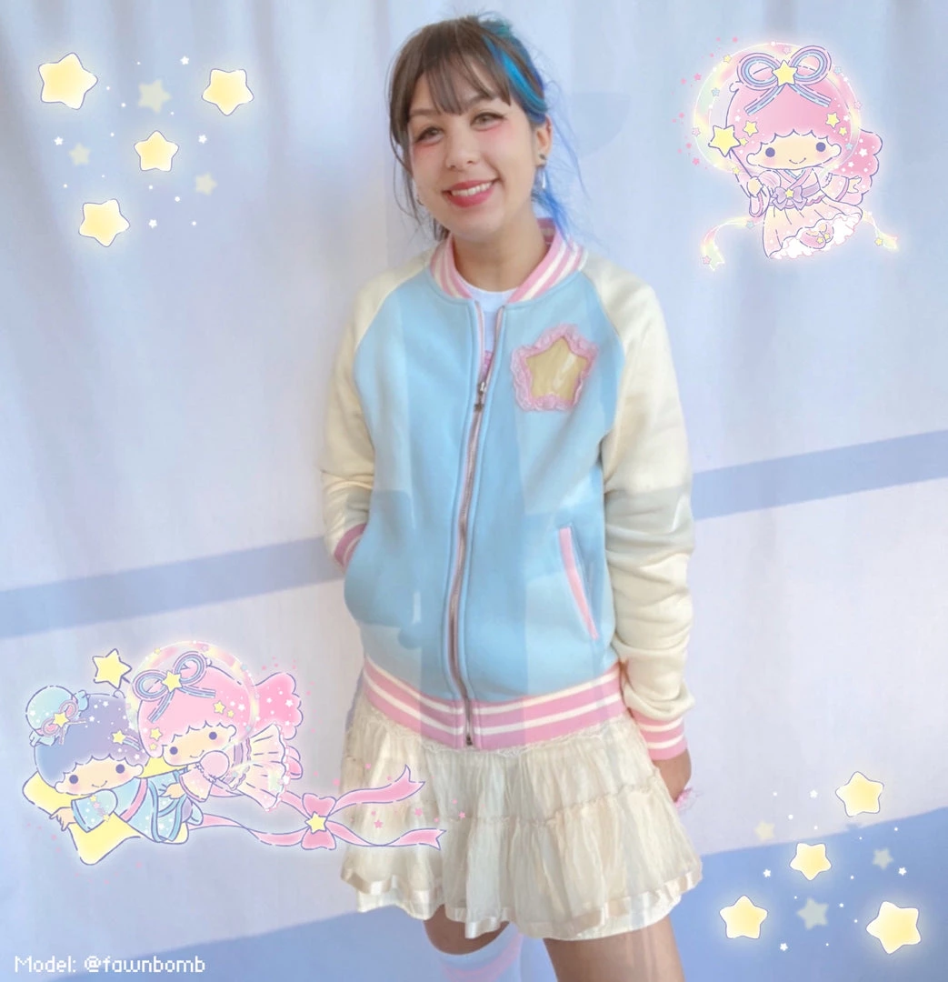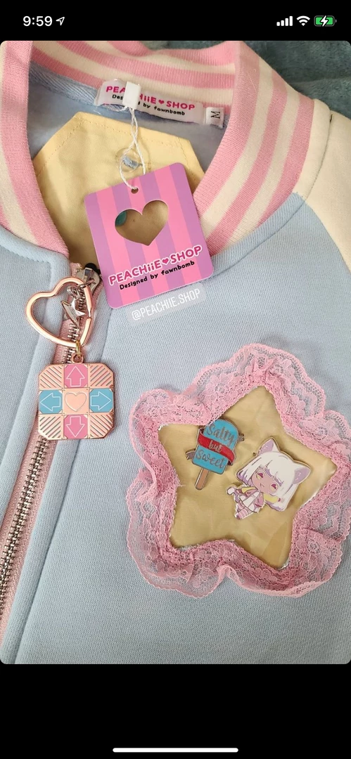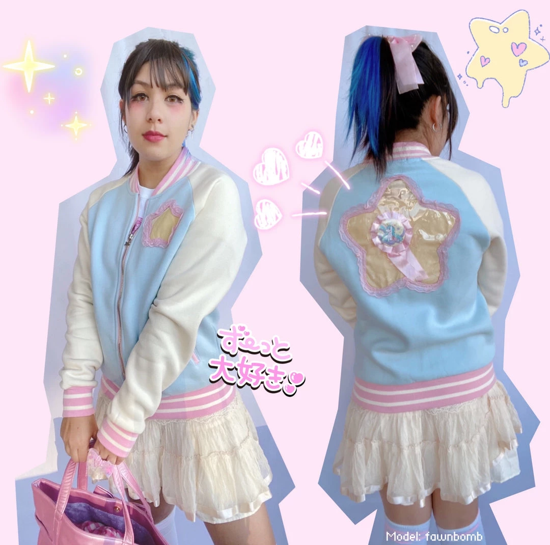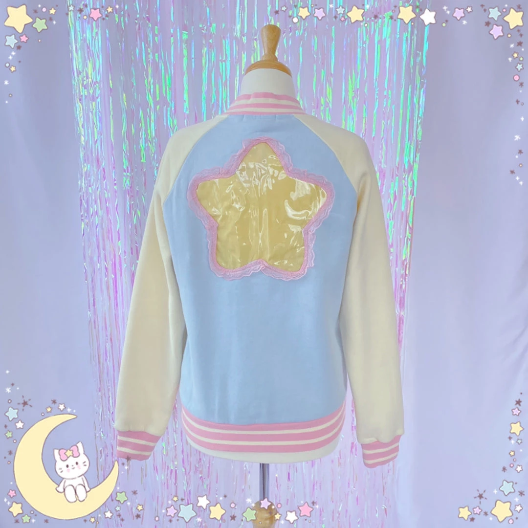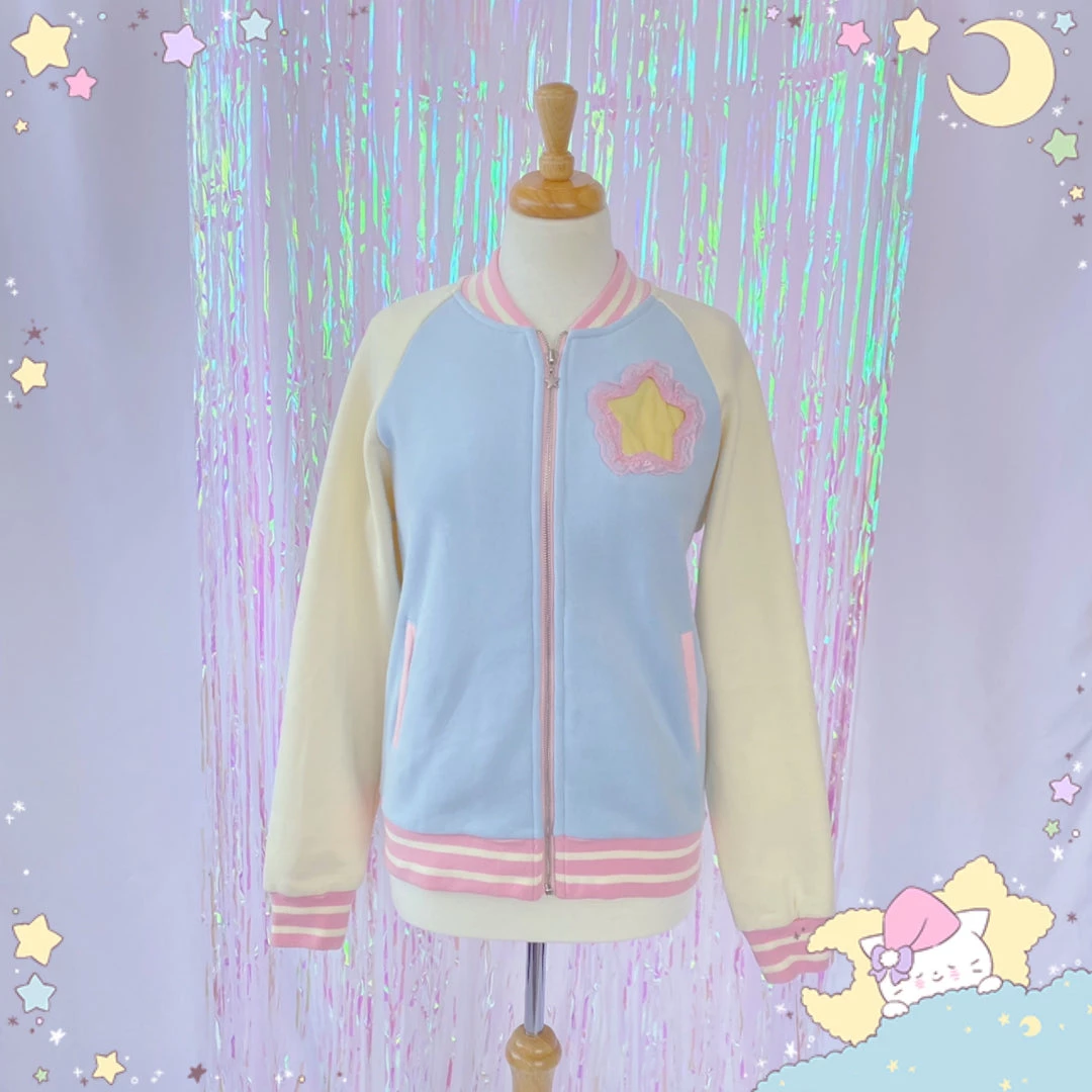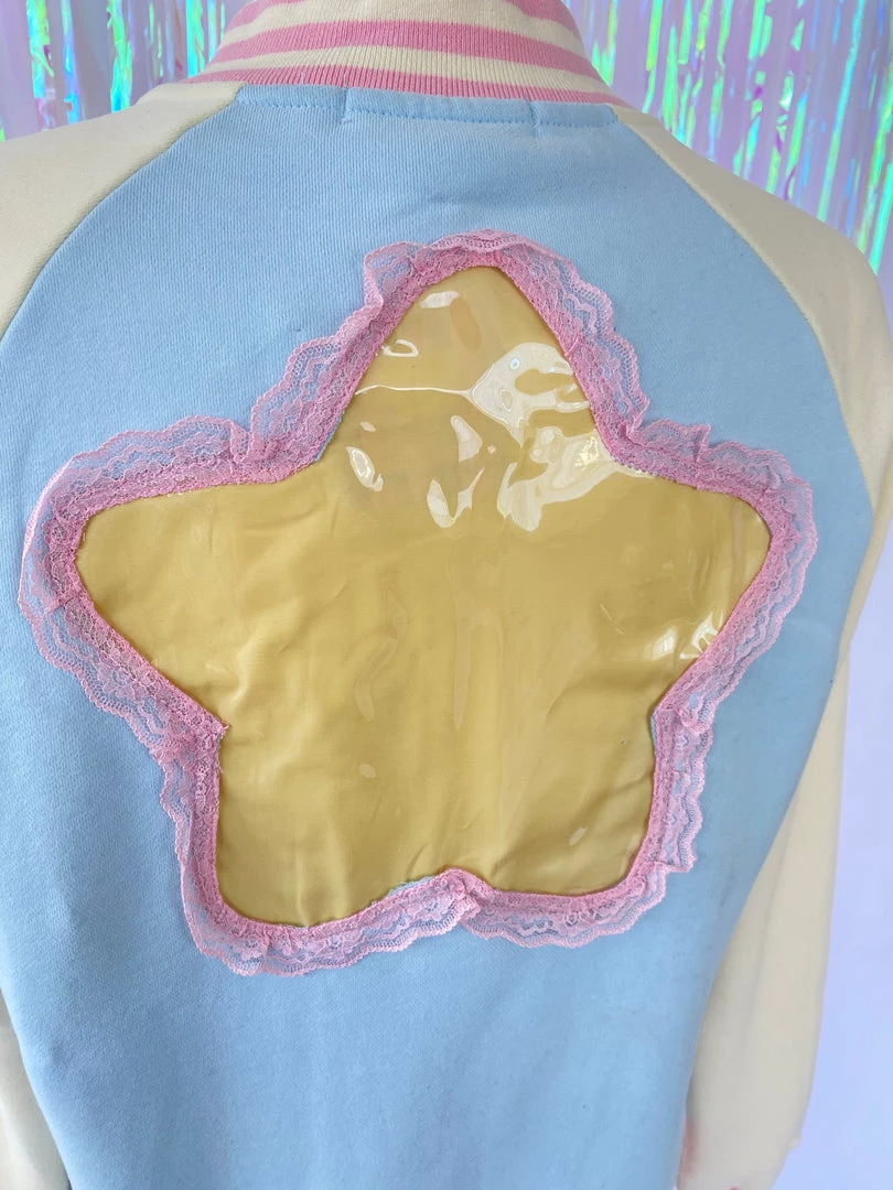 This pastel Ita Jacket is light blue with cream sleeves and pink trim!
