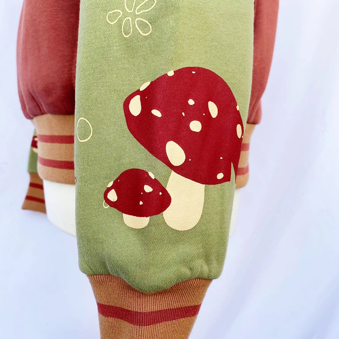 - Hand illustrated sleeves with large mushroom designs