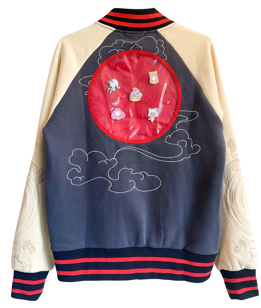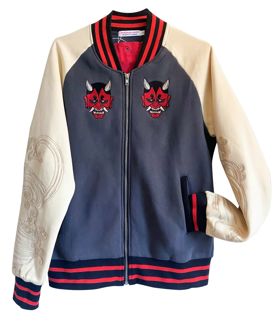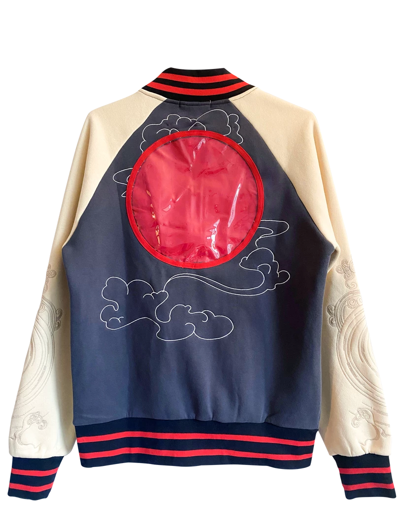 - Hand drawn embroidered sleeves inspired by traditional japanese sukajan