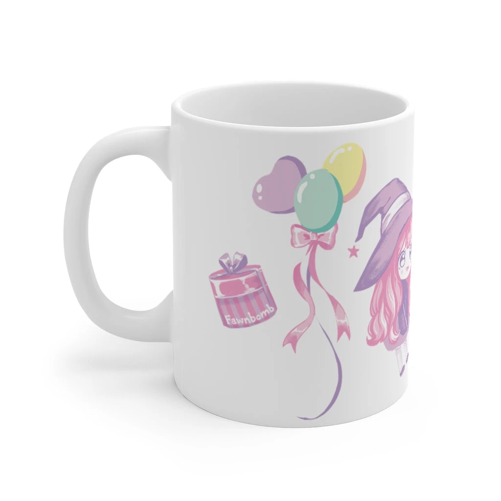 A cute and pastel mug featuring baby Baphomet with his friend Lilith the little witch, and her pet cat Fizz. – White ceramic – 11 oz (0.33 l) – C Handle – Ships from the USA