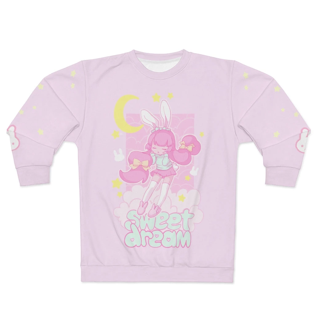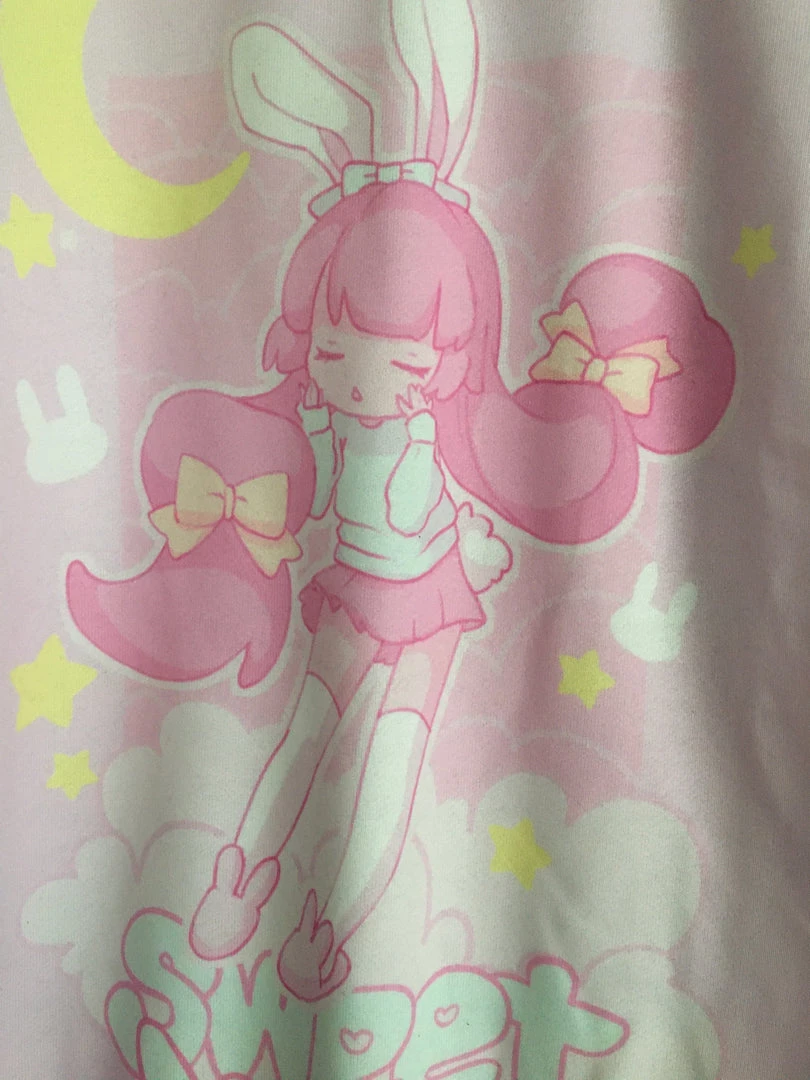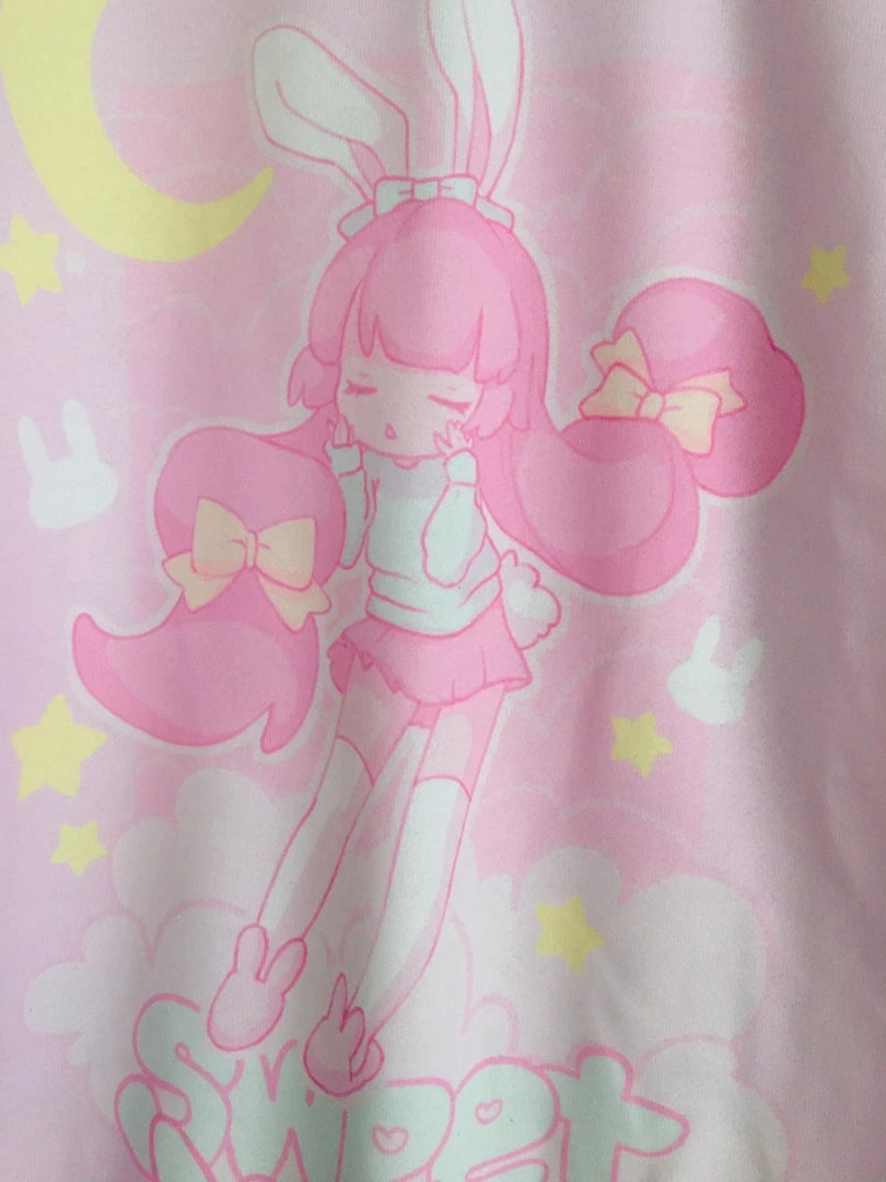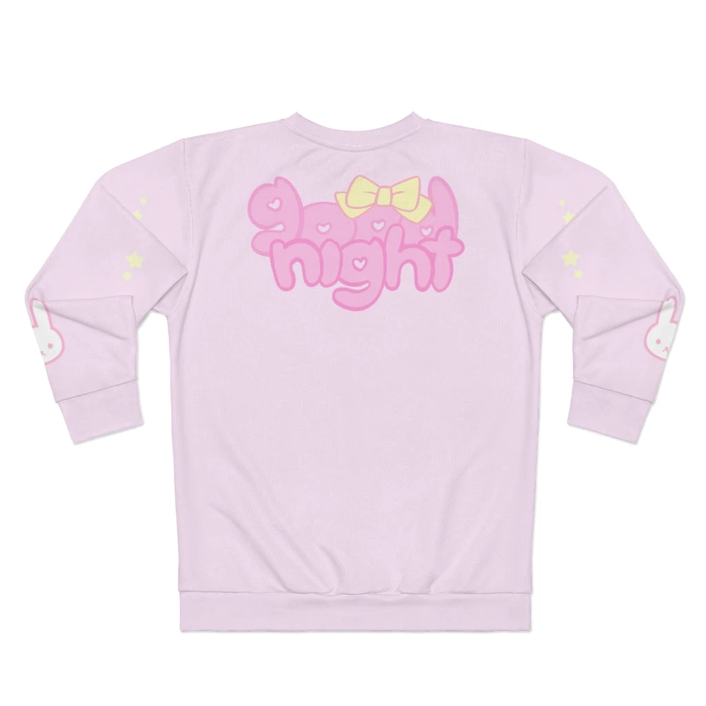 Fall into a cozy slumber with this adorable soft pink sweater featuring a cute bunny girl floating amongst fluffy clouds in the night sky.